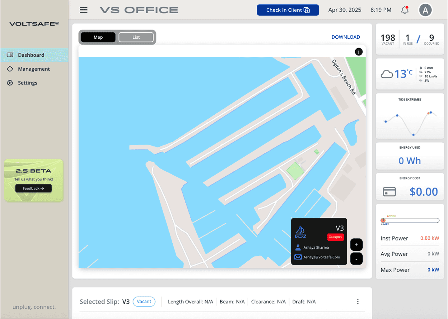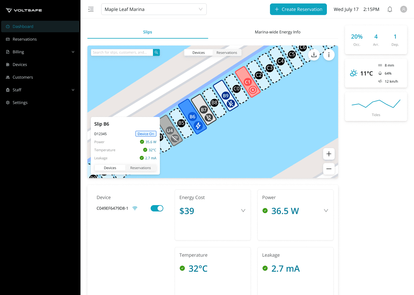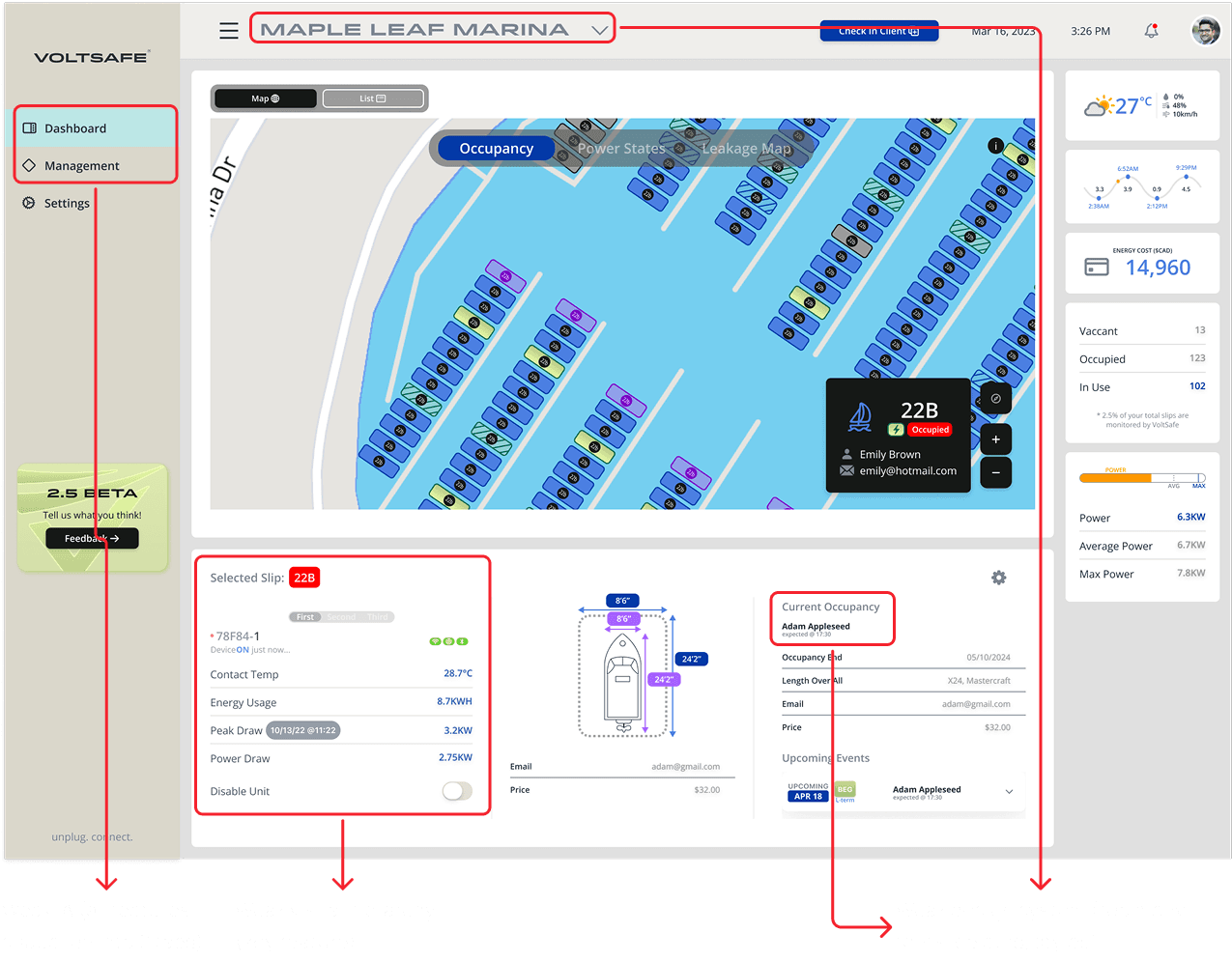 The specific product that I worked on, VoltSafe Marine, is an all-in-one solution that pairs a smart, marine-grade power pedestal (post with outlets to supply electricity) with a marina management software. It gives marina managers a single platform to manage power usage, reservations, and customer billing.