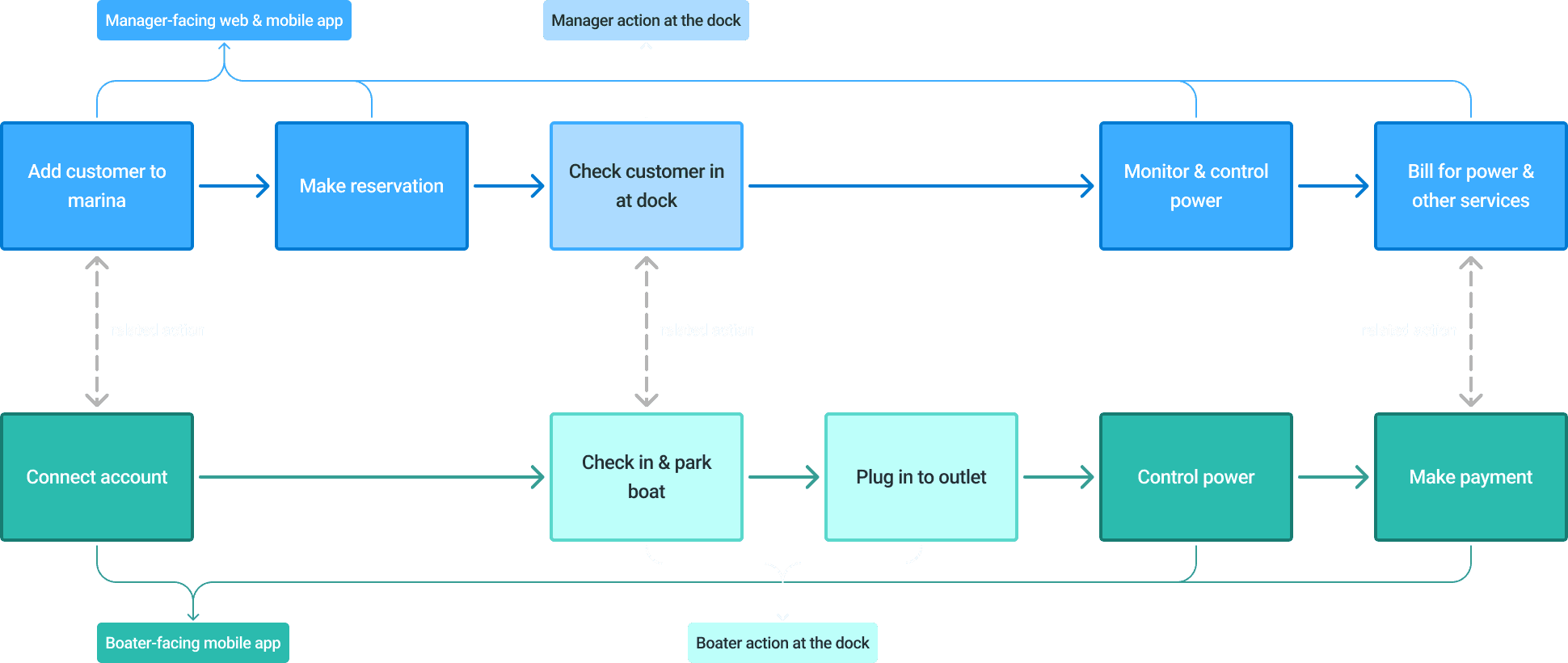 The flowchart maps out the marina manager journey (blue) and boater journey (green). It also highlights key touch points with our products, and how their experiences connect.
